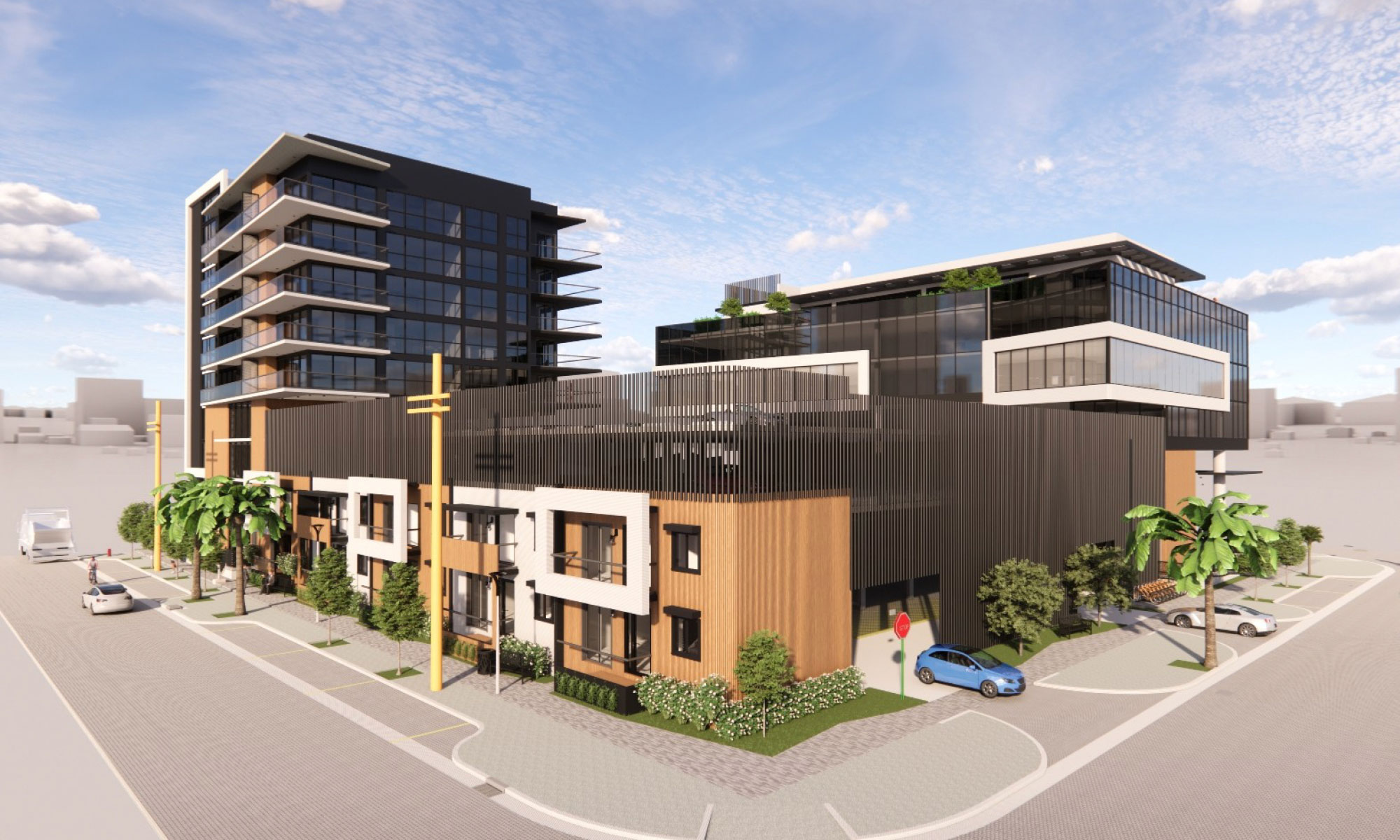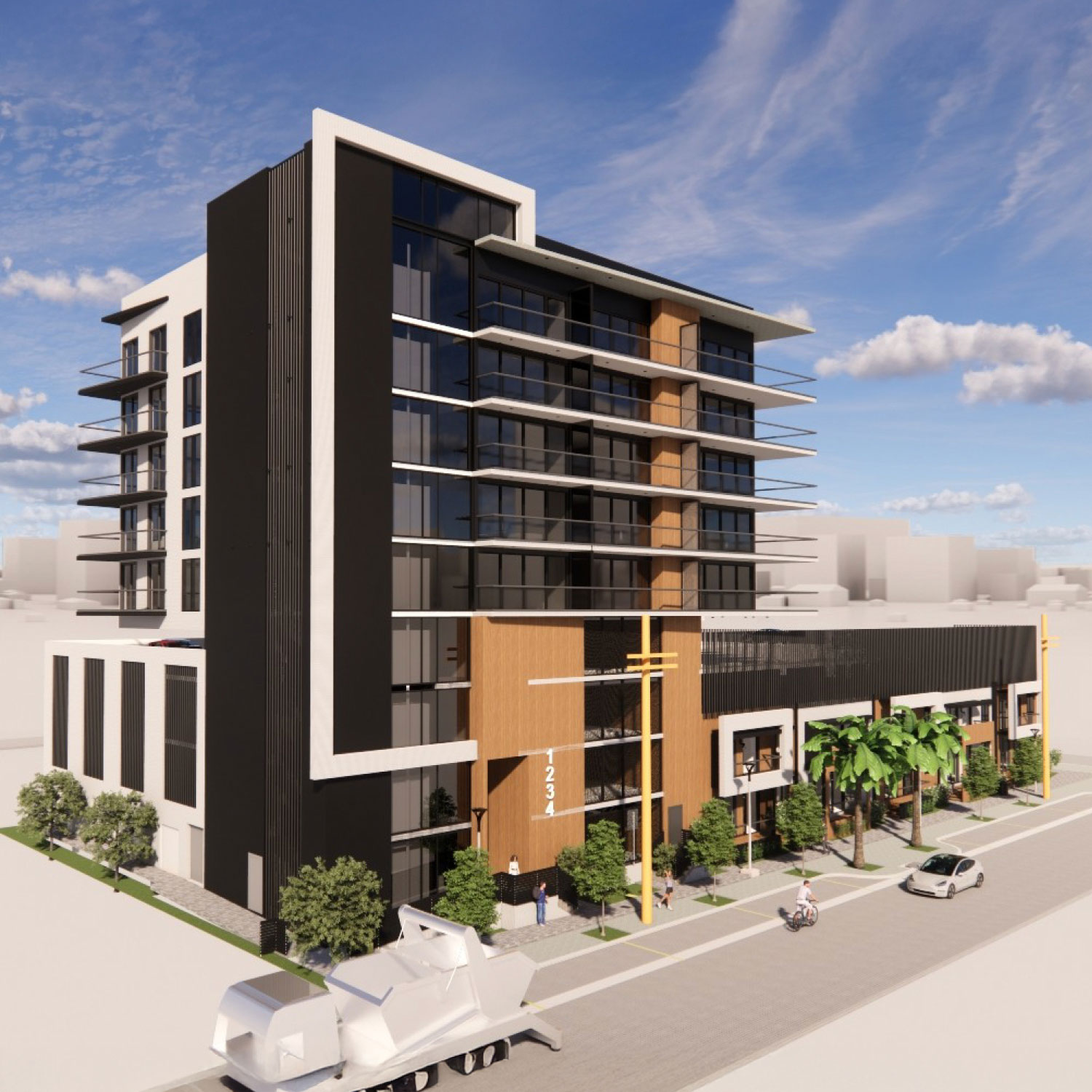 The first tower, fronting SE 9th Street, offers 10,000 square feet of ground-floor retail space and 30,000 square feet of modern office space across six stories, complete with rooftop amenities for tenants. The second tower, facing SE 9th Court, is a boutique residential building with five ground-floor townhomes (2 bed / 2 bath) and 35 one-bedroom residences across eight stories. A wellness center on the ground floor promotes a balanced lifestyle for residents.